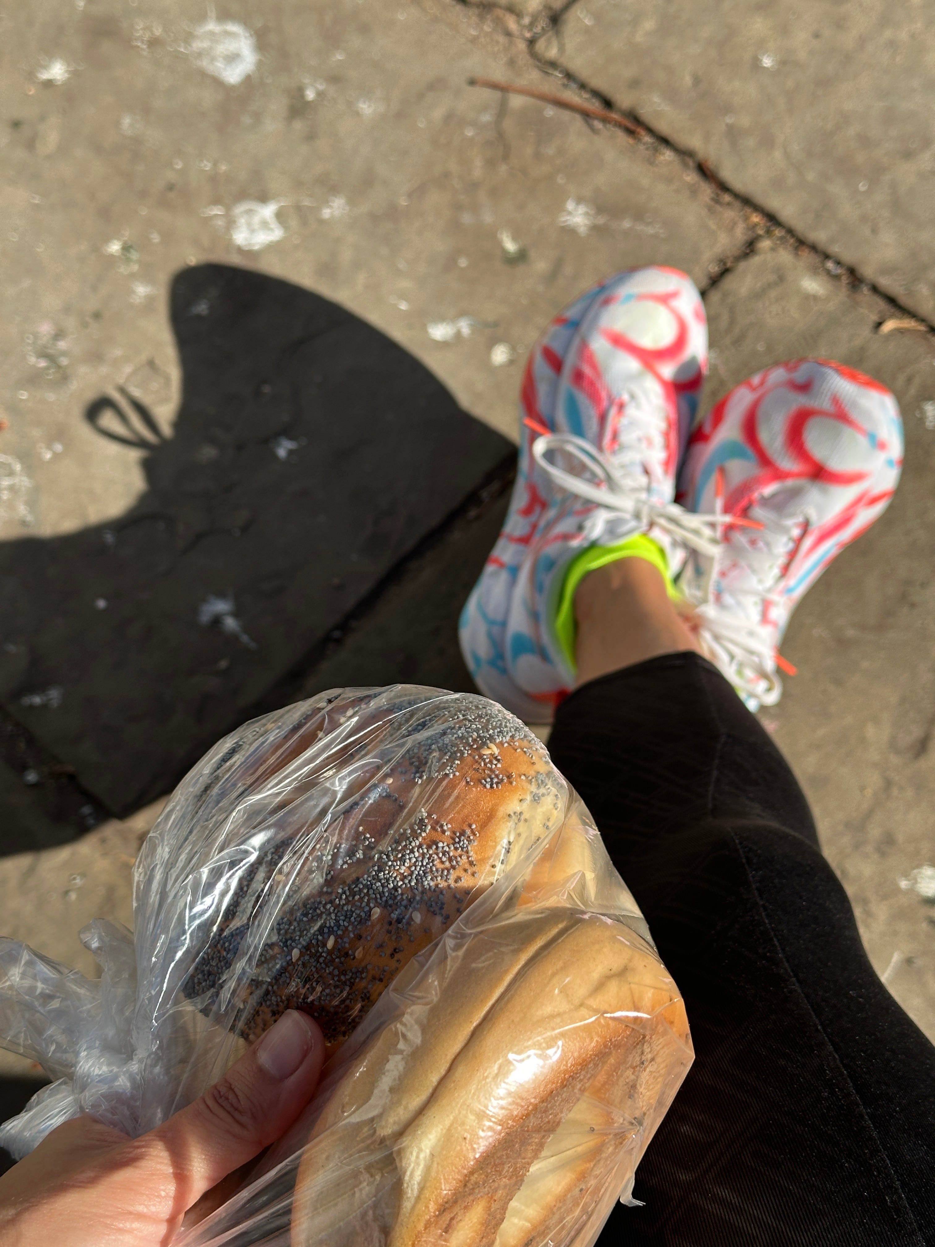 I run home with the bagels clutched in my hand — a carb dumbbell of sorts.